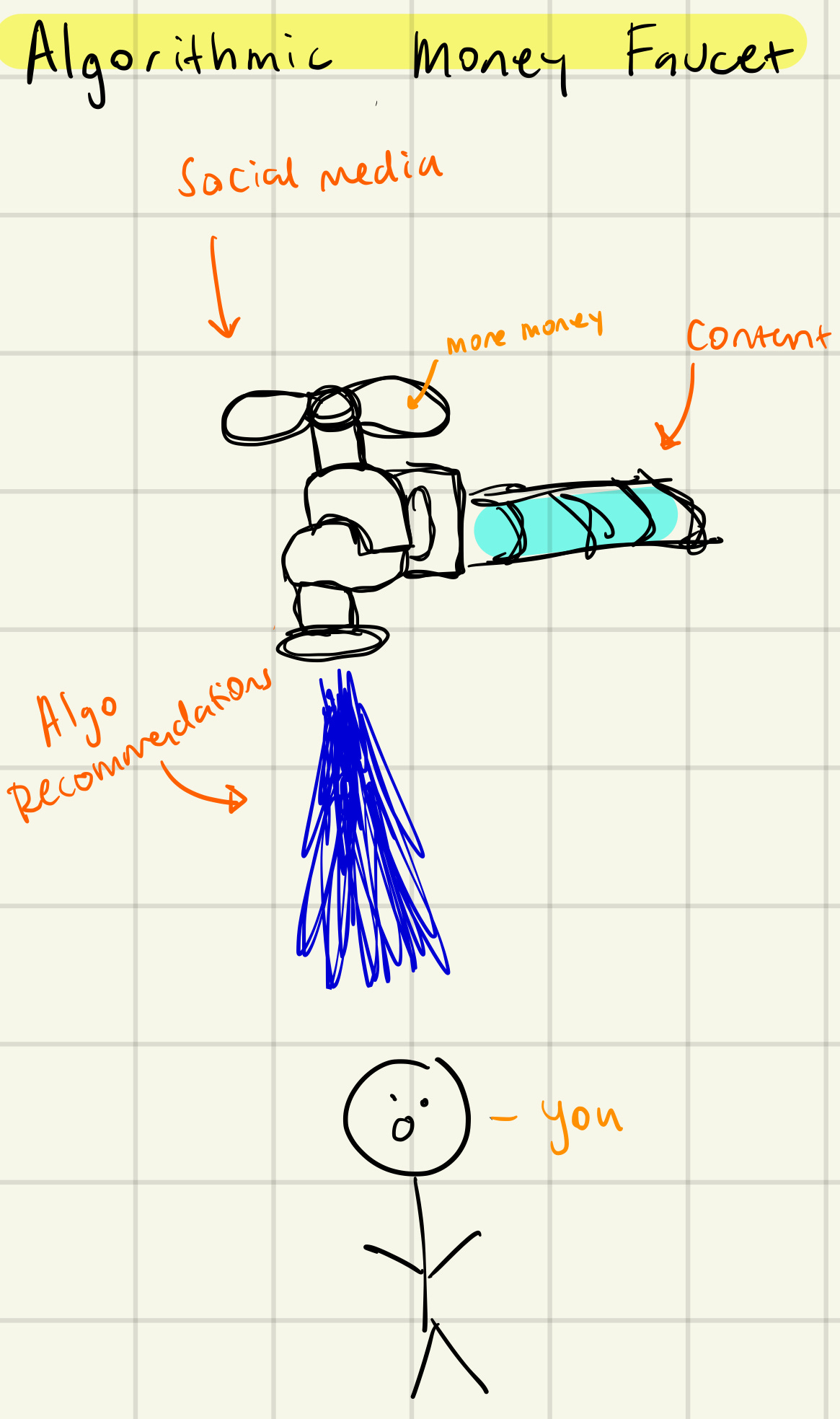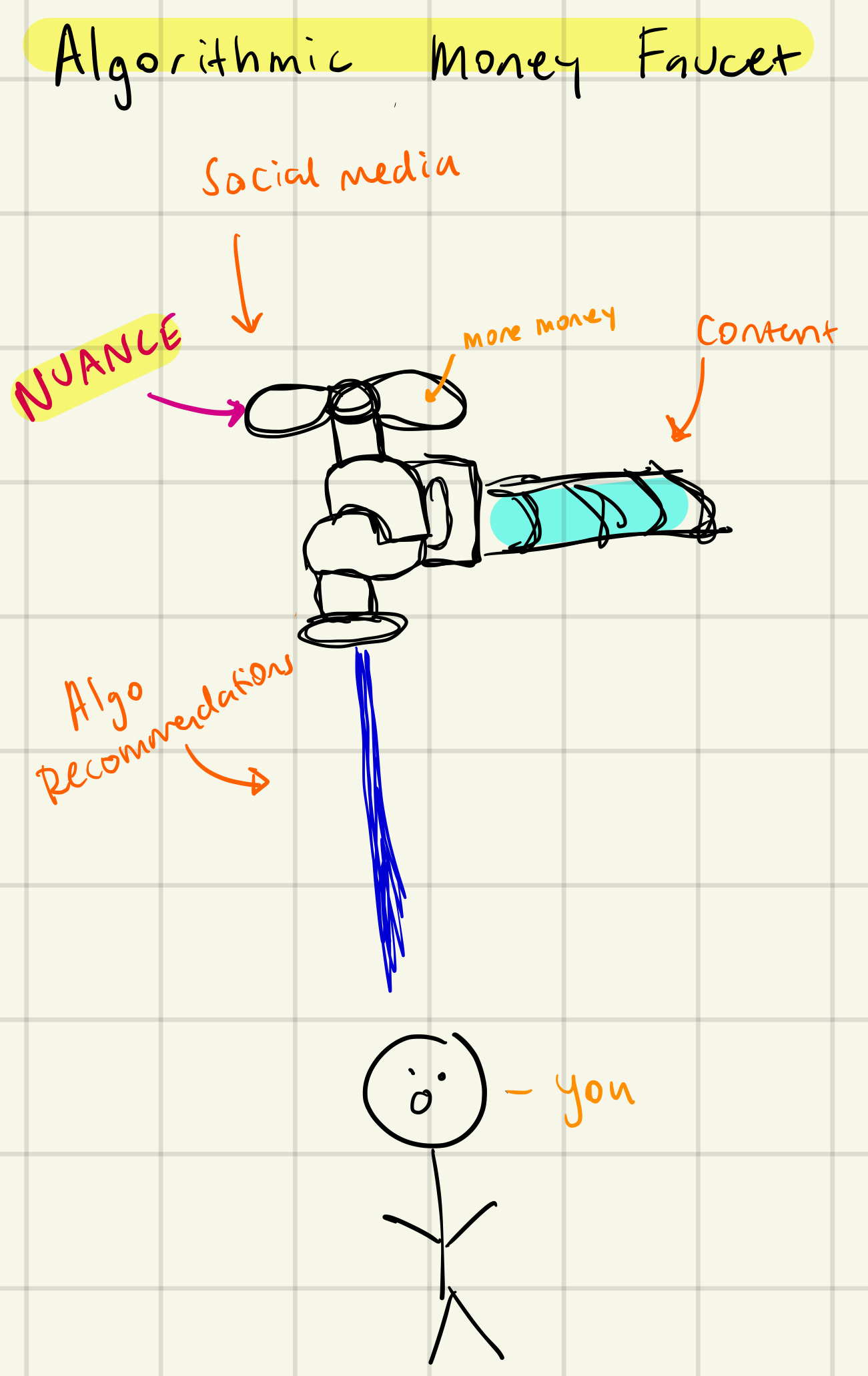 Content is the “water” in the algorithmic money faucet and social media is the “faucet” itself - but More Money controls the “spigots”. And the social media platforms are going to turn those spigots on full blast - which means that the users get drenched in content - which isn’t great.