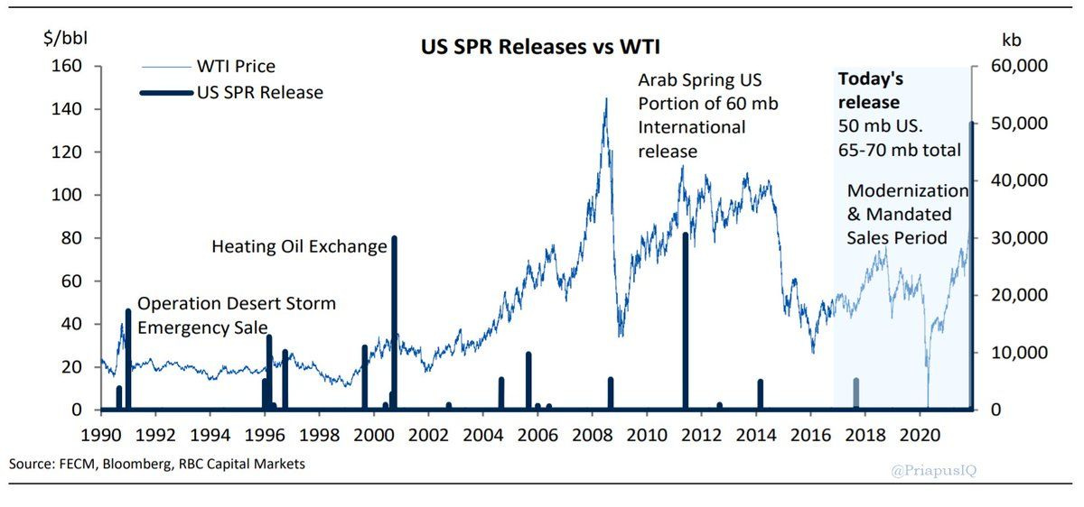 So because OPEC isn’t cooperating, the Biden Administration, in concert with other China, India, Japan, South Korea, and the UK tapped something called the Strategic Petroleum Reserve. The US will release ~50million barrels of oil on the market, which is roughly 2.5 days of demand (the US consumes 20m barrels/day).